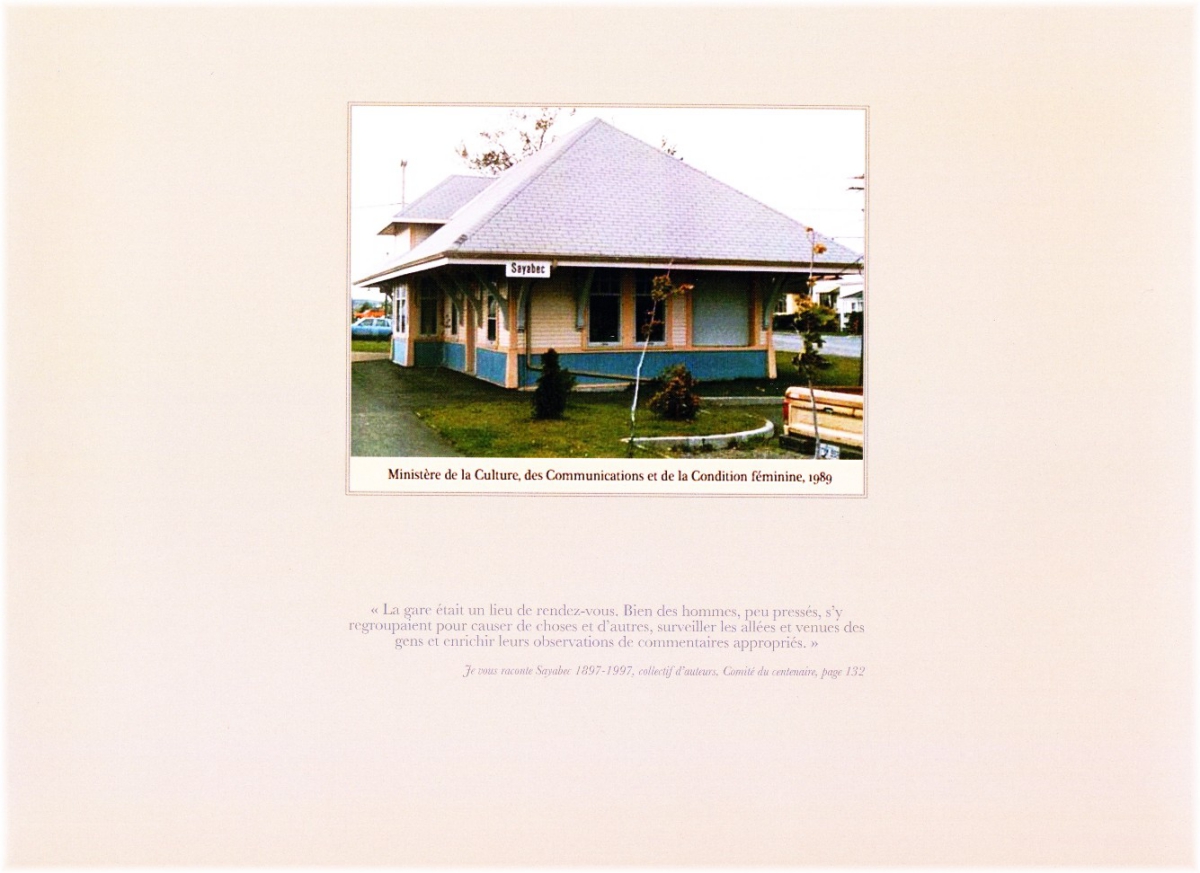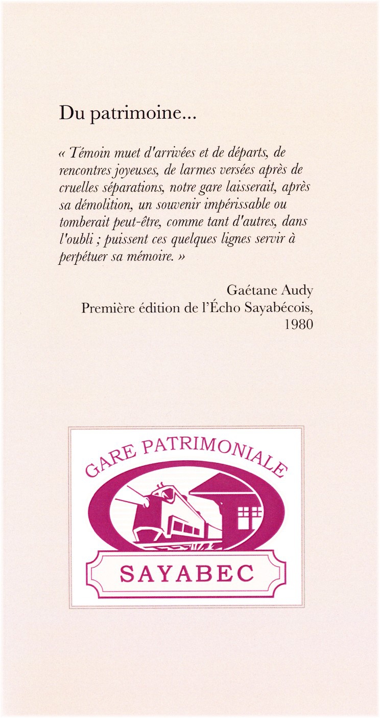 Gare patrimoniale de Sayabec La gare patrimoniale de Sayabec est un organisme sans but lucratif incorporé le 22 mai 2007. La mission de cet organisme consiste à mettre en valeur ce bâtiment construit en 1912, puis déménagé en 1997 sur son site actuel afin de conserver ce patrimoine bâti. Cette gare servira de lieu de rencontres pour mettre en valeur les activités culturelles du milieu. Elle permettra également de faire connaître notre histoire locale et régionale tout en offrant certains produits artisanaux et du terroir. Nous voulons que la population s’approprie cette richesse collective afin de donner une seconde vie à cet édifice historique.