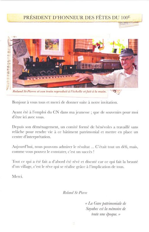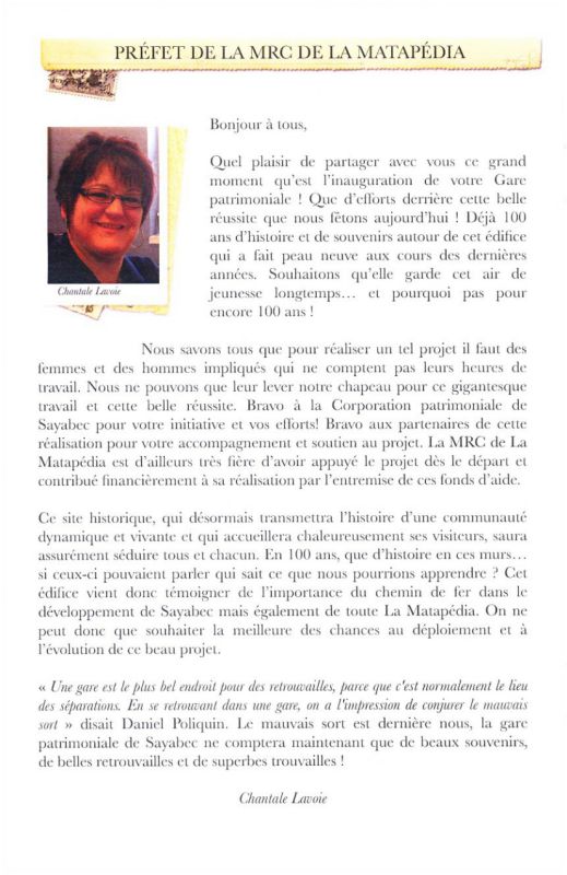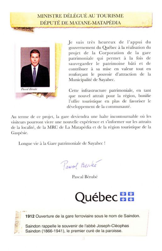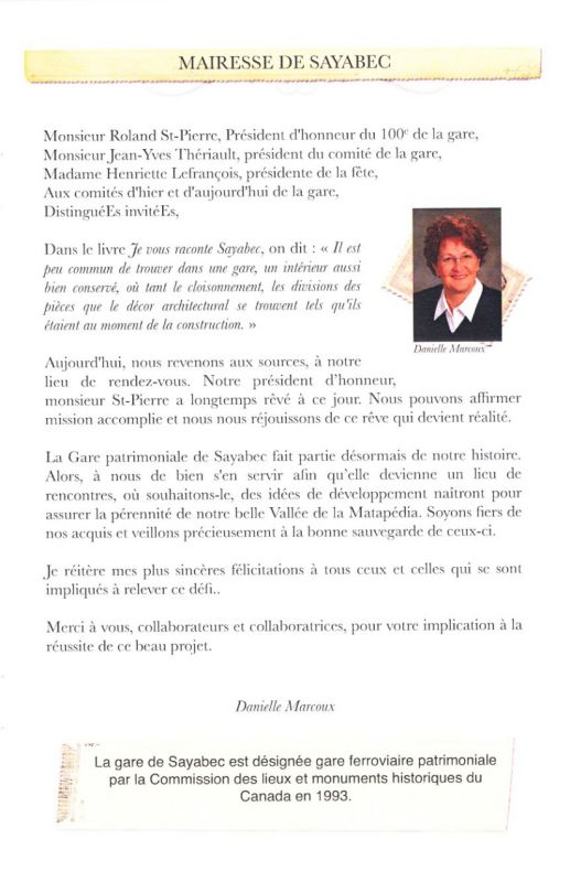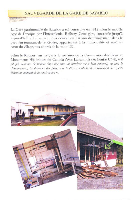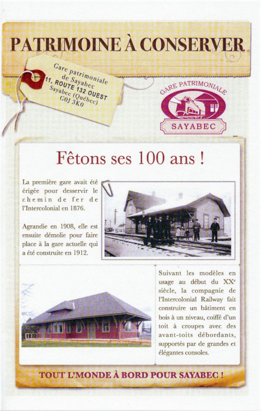 Sayabec - La gare patrimoniale de Sayabec, qui célébrait son 100e anniversaire en 2012, deviendra un lieu de rencontre gourmand et culturel. Un projet de restauration de la gare prévoit la rénovation de l’intérieur du bâtiment afin d’en faire un café-boutique et un centre d’interprétation du patrimoine où sera notamment relatée l’histoire de la gare et de la municipalité.