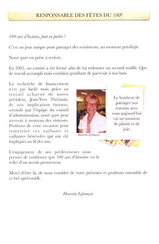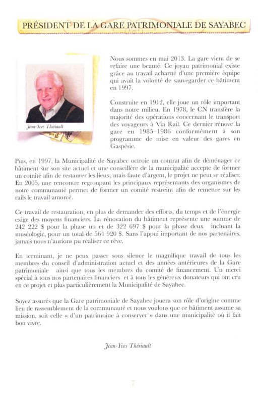 « C’est avec plaisir que nous accueillons cette bonne nouvelle. Ces deux subventions nous permettent de finaliser notre plan de financement servant à restaurer la gare reconnue comme patrimoine ferroviaire. La gare jouera son rôle d’origine comme lieu de rassemblement de la communauté et nous voulons que ce bâtiment assume sa mission de patrimoine à conserver dans une municipalité où il fait bon vivre » conclut M. Thériault.