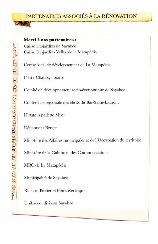 Depuis une quinzaine d’années, des bénévoles ainsi que plusieurs organismes, notamment le Comité de développement socioéconomique, le Comité culture et concertation, la MRC et le CLD de La Matapédia, ainsi que la Municipalité de Sayabec, appuient ce projet qui s’inscrit dans les priorités locales et régionales.